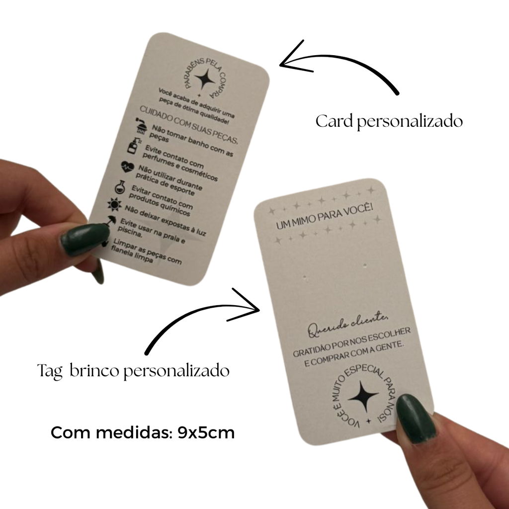 1 tag com furo para brinco, ideal para exibir suas peças com elegância;